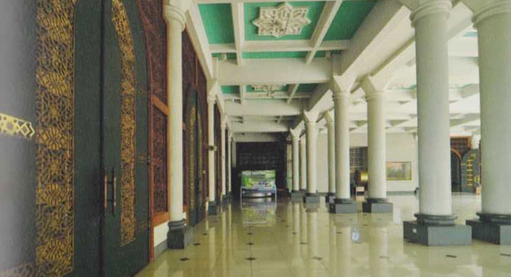 Motif corak batik ala arsitektur Islam mengisi bagian sisi mihrab. Sapuan warna kuning emas membuat bagian depan masjid terkesan sangat mewah. Keberadaan mimbar berornamen hias yang sama dengan latar belakangnya, semakin memanjakan mata pengunjung.