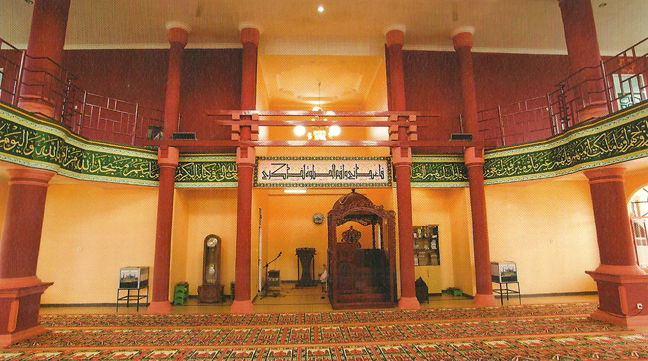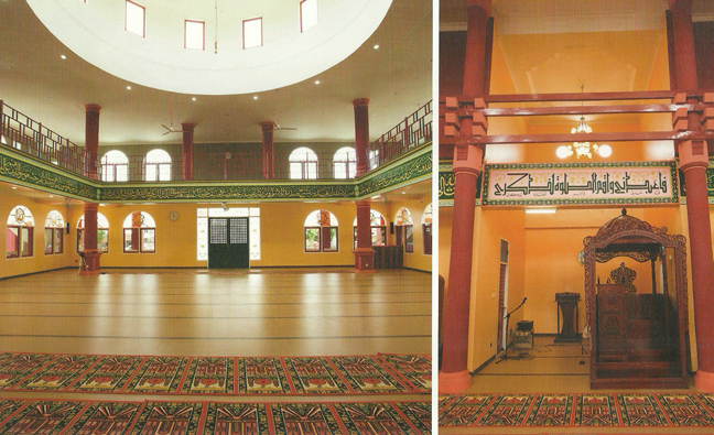 Sebagai penggantinya, dinding yang mengelilingi ruangan dihiasi kaligrafi bertuliskan huruf Arab. Dinding tersebut sekaligus menjadi batas lantai atas yang menjadi mezzanine di ruang utama ibadah.