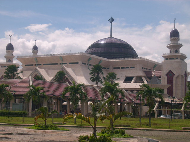 Di sekeliling bangunan utama tampak taman yang dihiasi lampu dan pohon palem yang diatur membentuk satu deret lurus antar-ornamen. Suasana ala Timur Tengah cukup terasa di area taman. Selain itu, selasar-selasar panjang yang menjadi akses masuk ke dalam masjid, dihiasi lampu dinding berwarna-warni di setiap tiang, sehingga semakin melengkapi keindahan bagian luar masjid.