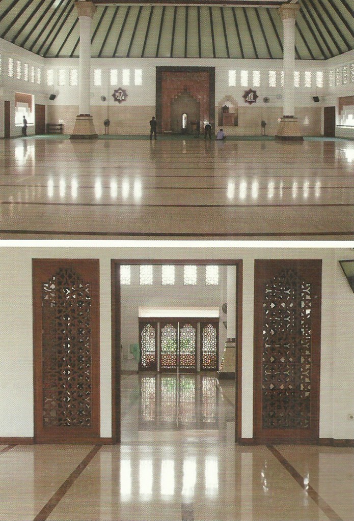 Di bagian dalam ruang utama yang digunakan untuk tempat ibadah, tata interior dibuat dengan ornamen yang cenderung tidak detail sehingga ruang utama terasa lapang. Dominasi warna putih cenderung krem yang mengesankan nuansa cerah menambah kelapangan tersebut.