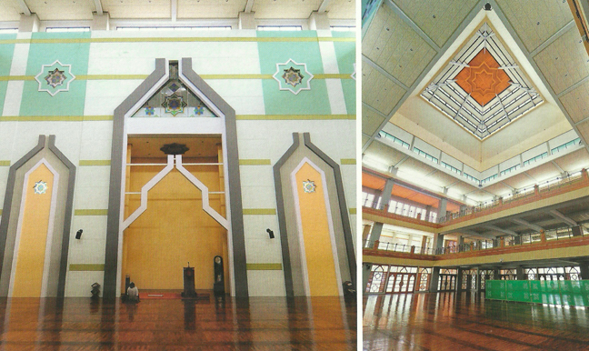 Memasuki ruang dalam masjid akan tampak efek lain yang dihasilkan dari bentuk limasan berundak, yakni efek pencahayaan yang membentuk garis tipis pada plafon masjid. Kesan modern masjid pun menjadi semakin tegas.
