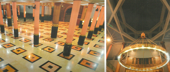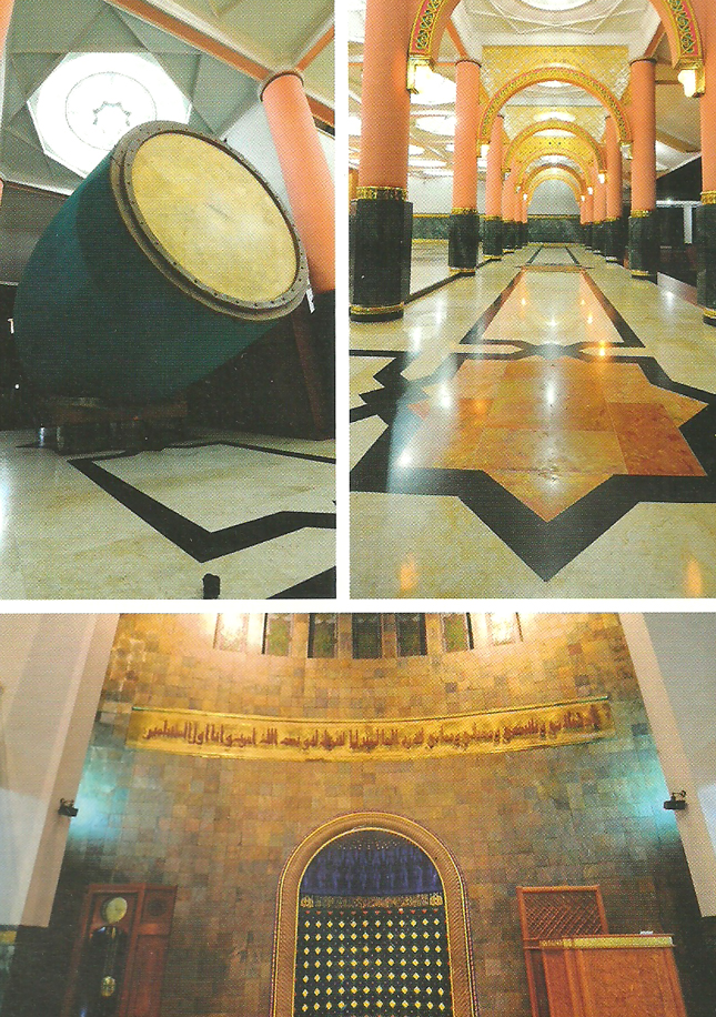 Penggunaan material marmer Italia (verde patricia) di bagian dinding dan marmer yang berasal dari berbagai wilayah Indonesia di bagian lantai membuat hawa sejuk menyelimuti masjid. Khusus untuk dinding depan mihrab, batu alam dari India memberi nuansa gelap merah kehijauan yang elegan. Di bagian mihrab ini, motif sarang lebah bernuansa biru yang diilhami mihrab Masjid Syiah di Irak menjadi santapan visual yang sangat indah. Di bagian bawah ornamen sarang lebah terdapat kaligrafi QS. An-Nuur: 35, sedangkan di mimbar khotbah tertulis kaligrafi QS. Fushshilat: 33. Kaligrafi ini tepat di atas kombinasi keramik asal Brazil yang memberi efek kontras dengan batu India yang gelap.