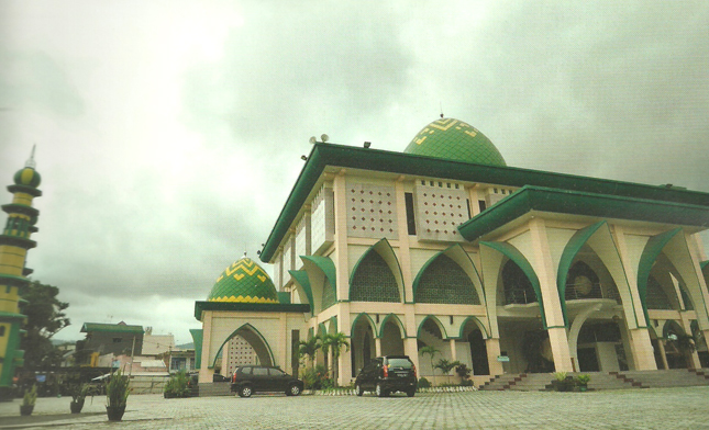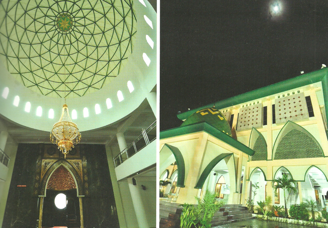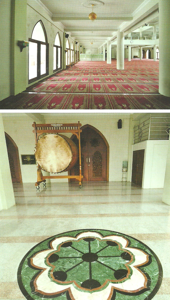 Melangkah ke dalam, akan tampak pintu dan jendela masjid yang dihiasi ornamen kaligrafi ayat-ayat Al-Quran dan Asma’ul Husna. Di sisi timur masjid terdapat pintu yang mengarah pada beduk berukuran cukup besar. Ruang utama ibadah terdiri dari dua lantai. Lantai kedua dibuat mengelilingi lantai pertama seperti mezzanine.