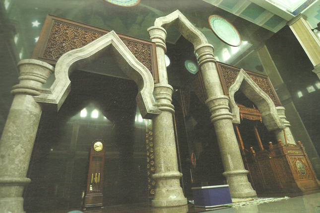 Bagian mihrab masjid tampil megah dengan batu marmer berwarna hitam dan ceruk ruang yang dipigura oleh tiang dan lengkungan artistik berbahan batu alam berwarna krem muda. Seperti halnya masjid megah di Jawa pada umumnya, elemen hias kayu ukir pun tidak luput dari masjid ini. Elemen tersebut dapat dilihat di sisi kanan dan kiri atas ceruk mihrab dan mimbar.