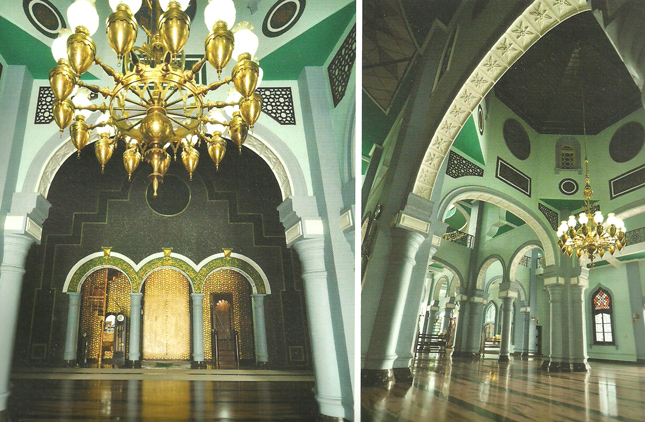 Bagian dalam masjid yang banyak menggunakan pola lengkungan untuk menghubungkan tiang penyangga sehingga menghasilkan pola ruang dengan kolom-kolom, sepertinya terinspirasi dari ruang dalam Masjid Cordoba, Spanyol.