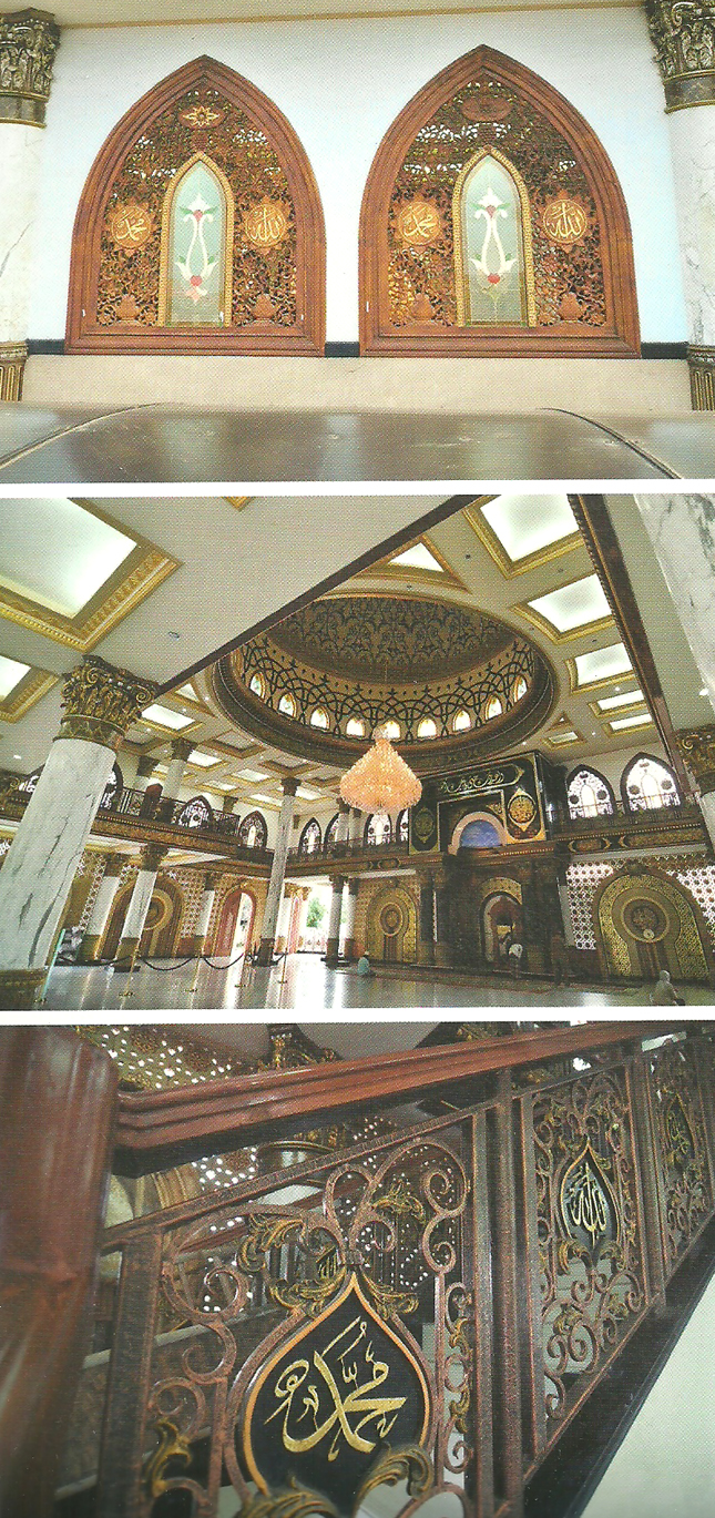 Sejak dari luar bangunan, elemen kaligrafi dengan nuansa warna emas sudah tampak menghiasi bangunan. Memasuki bagian dalam, pengunjung akan melewati teras berbentuk ruang dengan plafon bulat terbuat dari kaca hias patri yang seakan-akan memberi sambutan untuk sebuah perjalanan religi penuh keindahan.