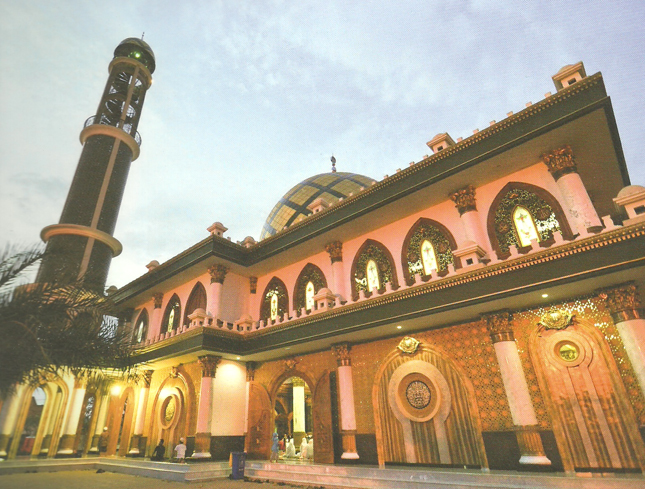 Masjid terlihat sangat indah dengan bangunan besar yang kokoh dan detail ornamen yang tersebar di seluruh bagian bangunan. Keberadaan dua menara yang menjulang tinggi di sudut sayap kanan dan kiri bangunan juga semakin memperkuat kemegahan rumah ibadah tersebut.
