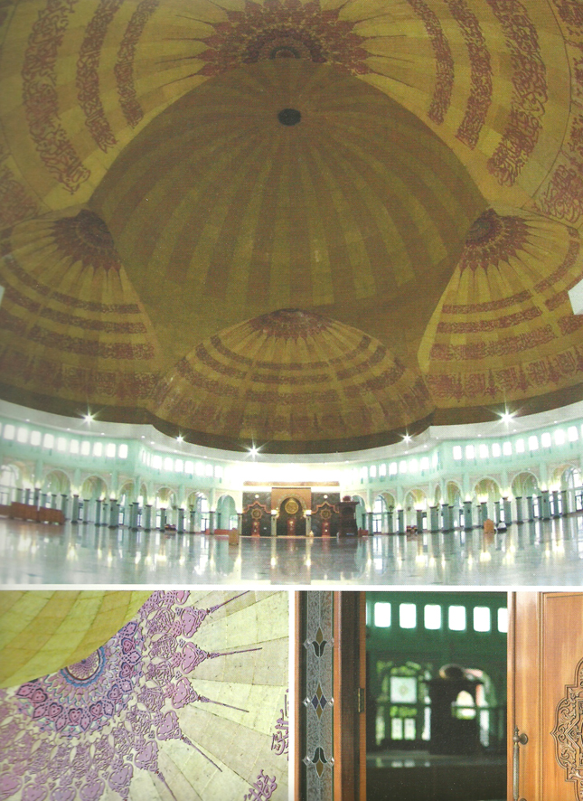 Di area tengah tersebut, terlihat jelas keindahan bagian dalam kubah yang bertuliskan ayat-ayat Al-Quran, yang ditorehkan di atas material berwarna cokelat muda kekuning- kuningan. Material ini berpadu serasi dengan lantai batu granit berwarna white-star yang didatangkan khusus dari Cina. Sebuah kombinasi yang menimbulkan suasana syahdu namun cerah.