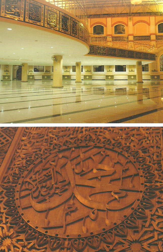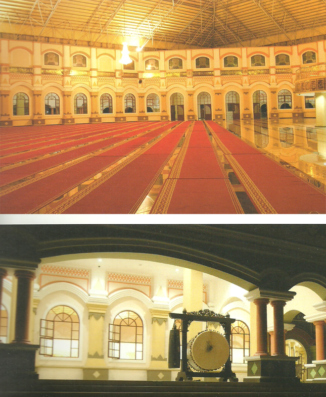 Di dalam akan terasa sangat lapang karena tidak menggunakan tiang penyangga. Kalaupun ada ruang yang tertutup oleh lantai atas, hanya sekitar seperlima dari luas ruang keseluruhan. Plafon masjid yang sengaja dibiarkan polos dengan menampilkan rangka besi penyangga atap beralur mengerucut ke atas semakin menambah kesan artistik.