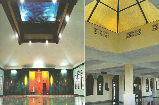 Bagian atas masjid yang digunakan sebagai ruang utama ibadah terlihat sangat lapang karena tidak ada tiang penyangga. Kesederhanaan yang ditampilkan lantai berwarna abu-abu berpadu dinding depan yang dilapisi keramik abu-abu tua, sangat kontras dengan bagian dalam kubah yang menampilkan gambar langit biru cerah. Sebuah pemandangan yang sangat indah.