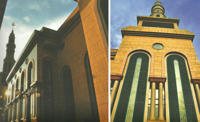 Menara berjumlah tujuh buah, satu menara induk dan enam menara yang yang lebih kecil di bangunan masjid. Menara induk memiliki tinggi 99 meter, menyimbolkan jumlah Asma’ul Husna. Adapun enam menara lainnya merupakan simbolisasi rukun iman.