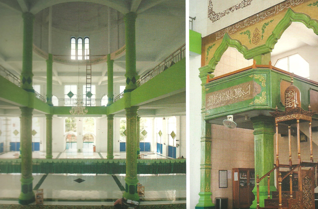 Kaligrafi yang terlihat cukup mencolok terletak pada bagian mimbar khotbah yang terbuat dari kayu jati.