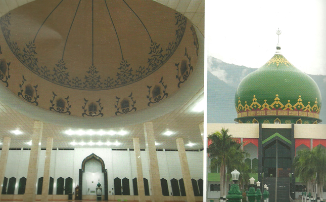 Bentuk kubah yang dilapisi dengan bahan seperti keramik mengilat berwarna hijau dengan aksen hias kuning menjadi padu dengan konsep bangunan masjid itu sendiri. Pemandangan yang harus diakui sangat menawan.