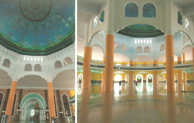Bagian plafon di bawah atap kubah juga berwarna cerah. Paduan biru langit dengan aksen kaligrafi jingga dan lafaz Allah yang tepat berada di tengah membuat tampilan plafon menjadi sangat menarik.
