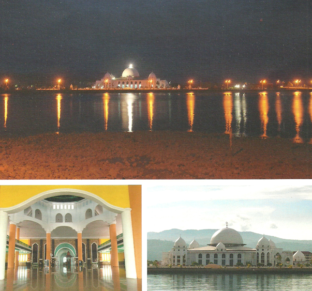 Masjid didominasi oleh warna putih di sekujur bangunan dan delapan kubahnya. Warna yang melambangkan kesucian tersebut terlihat sangat padu dengan nuansa warna laut di sekitar masjid.