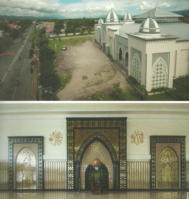 Dari luar, masjid tampak megah namun bersahaja karena memainkan kombinasi dua warna, putih dan abu- abu muda. Tidak banyak detail aksen di sekujur tubuh bangunan, hanya model hias kerawang dan relung tangga masuk masjid yang berbentuk lancip.