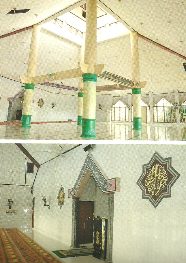 Ruang utama masjid terletak di lantai dua. Saat memasuki ruang ini akan tampak dominasi warna putih cerah dari keramik lantai dan dinding. Tepat di bagian tengah ruang terdapat empat buah tiang penyangga yang menopang atap berbentuk limas.